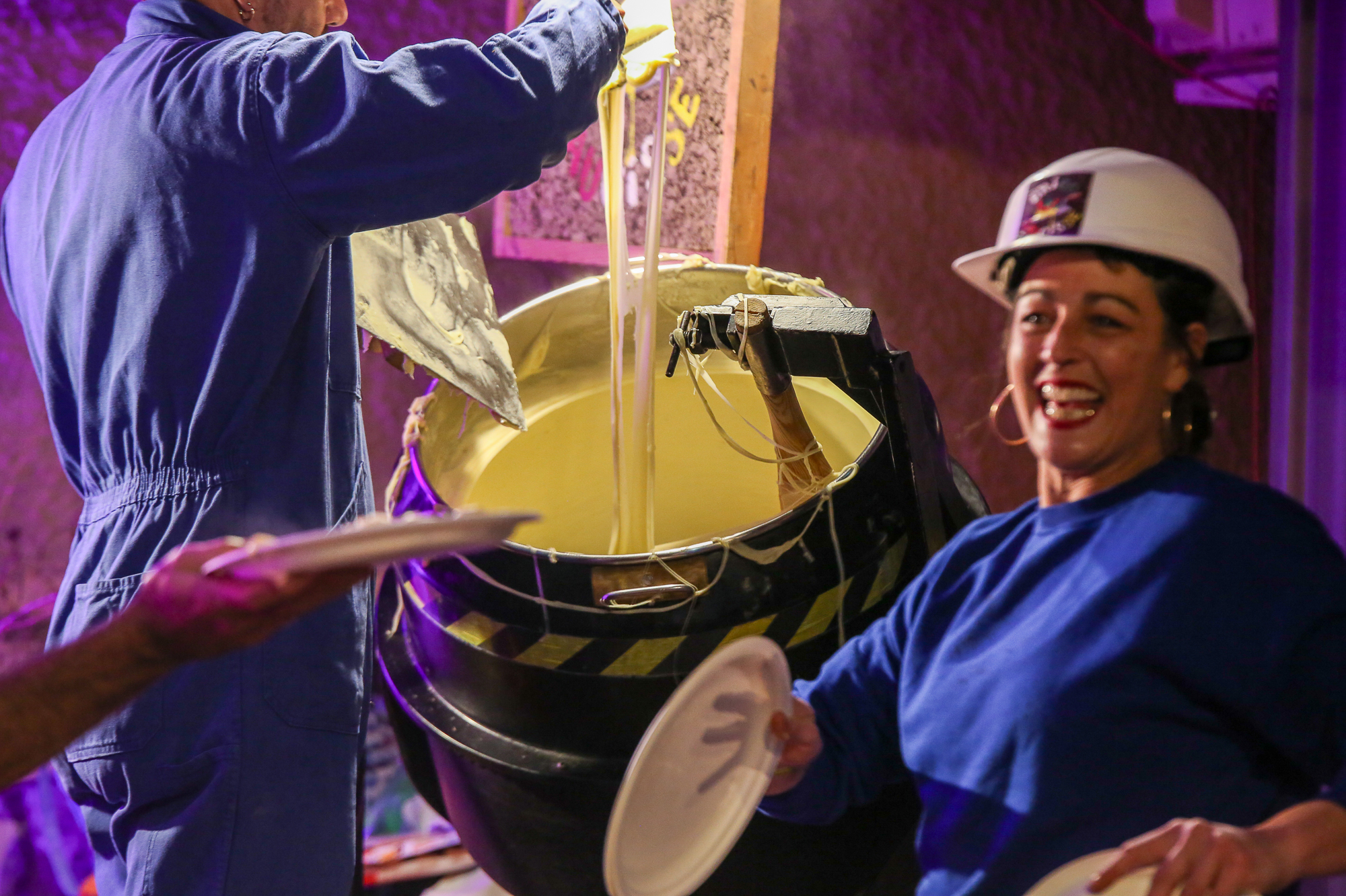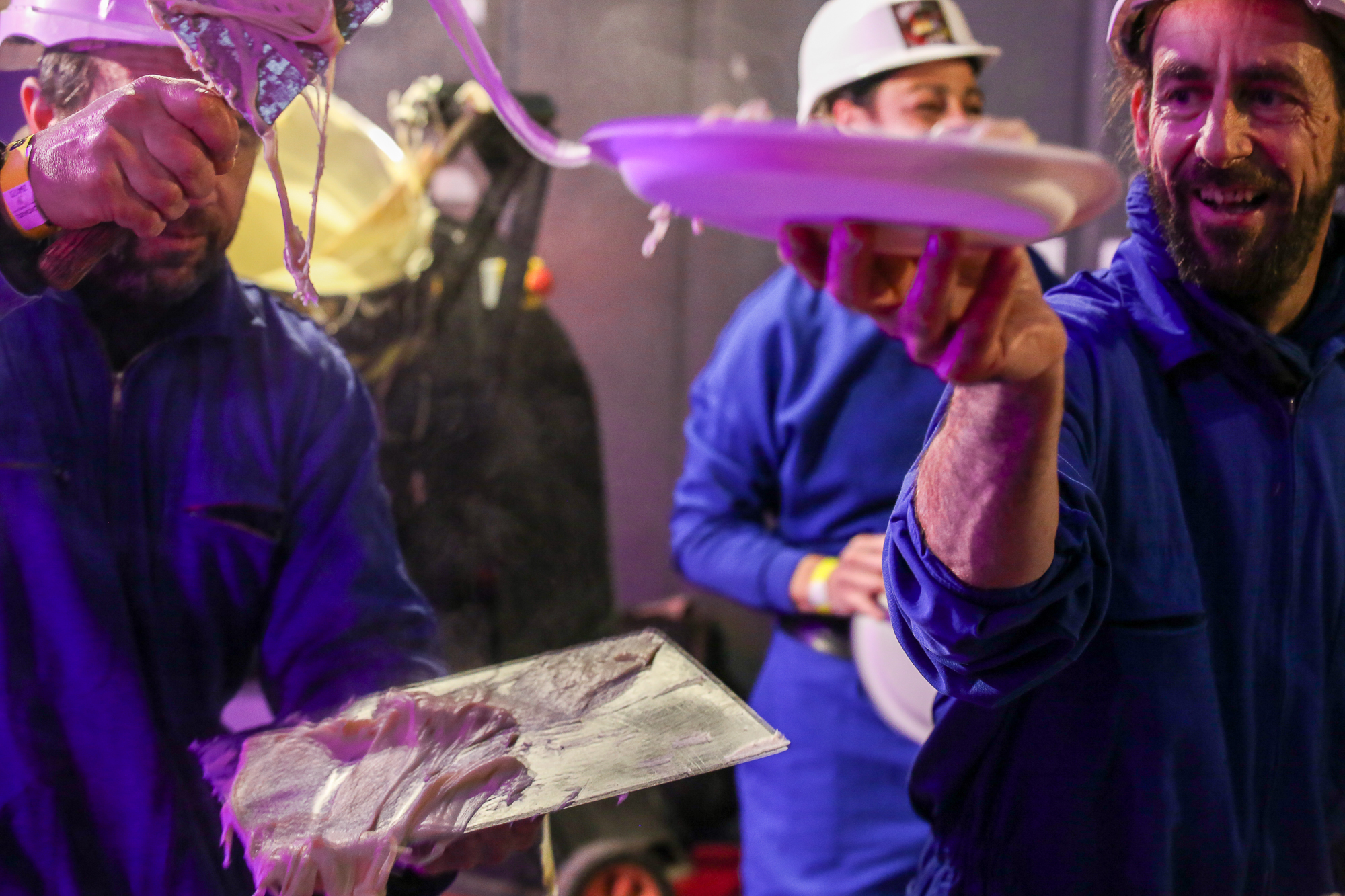 Il commence à faire faim et nous jetons notre dévolu sur le projet musico-culinaire de Brico saucisse que nous avions largement validé à Victoire 2 au printemps dernier. Le concept est magique : un aligot préparé dans une bétonnière puis servi à la truelle, un ouvrier perché qui grille les saucisses avant de les projeter dans les airs et des pirouettes pour les attraper et y ajouter quelques feuilles de salade. Le tout agrémenté de bonne musique et de bouteilles de Kro. C’est bon, c’est génial et plein de bonne énergie !