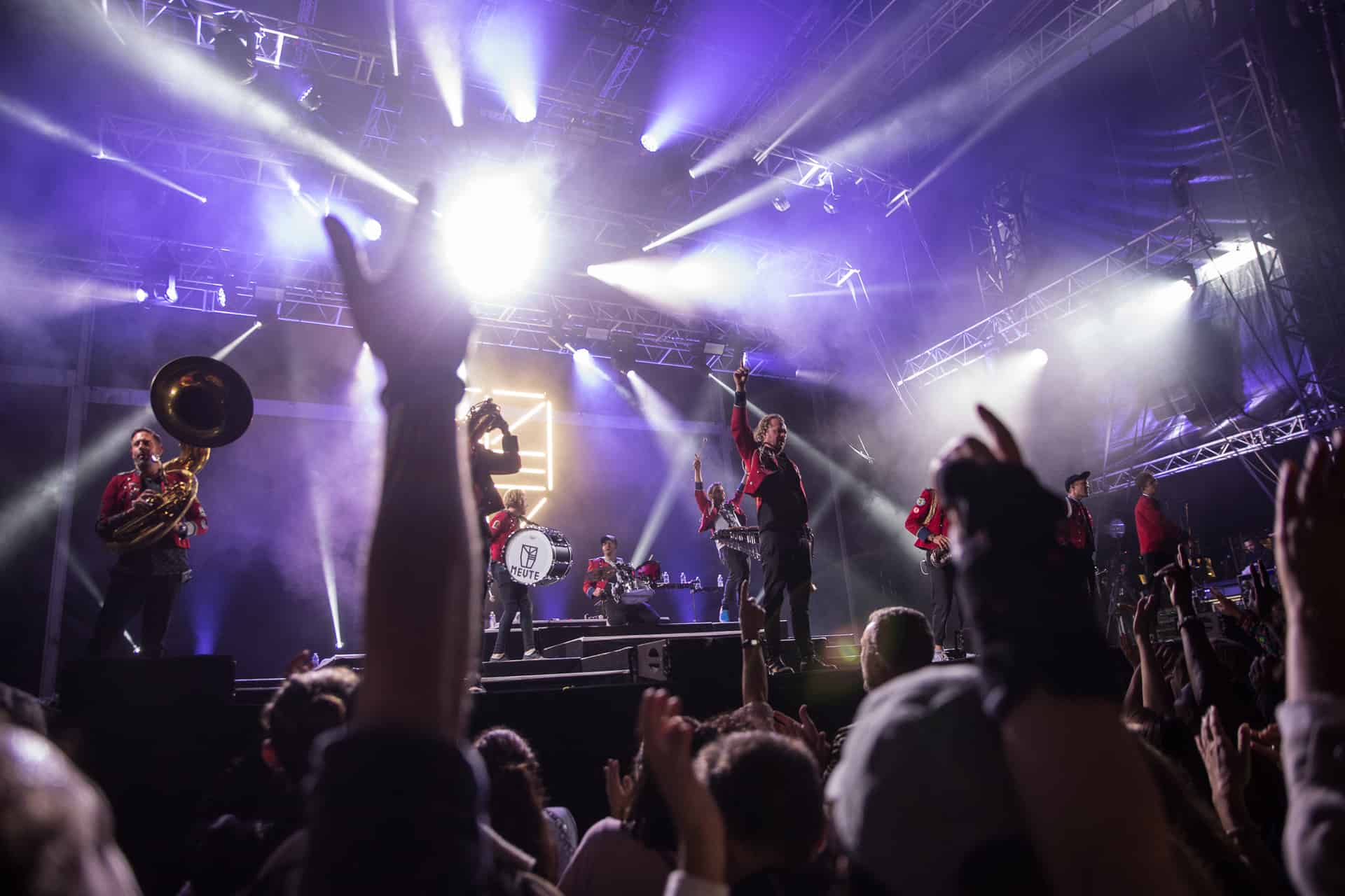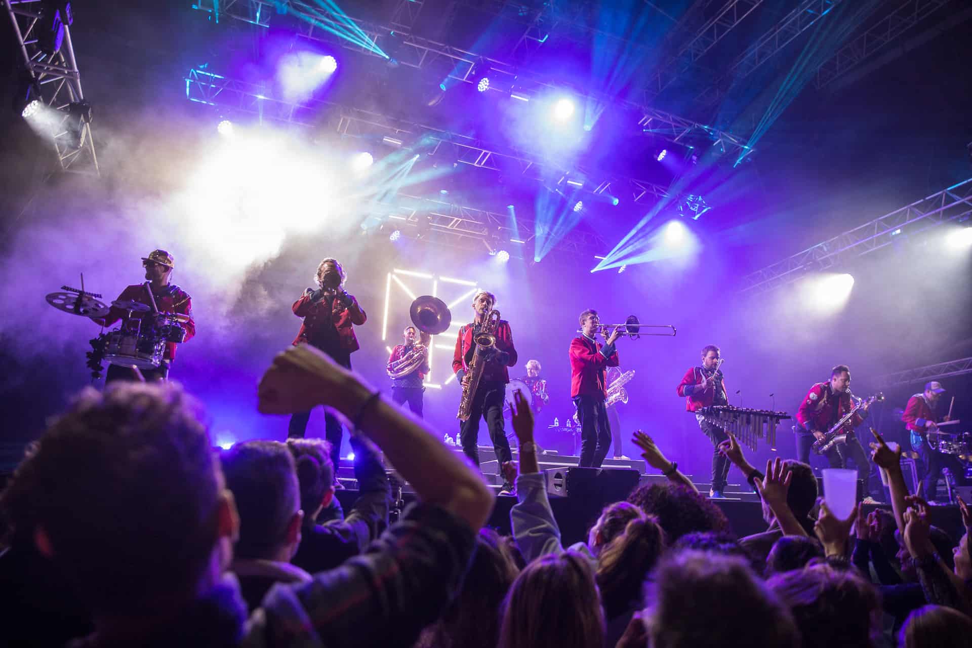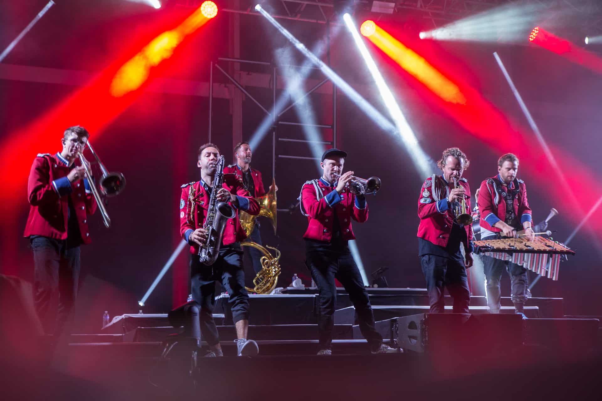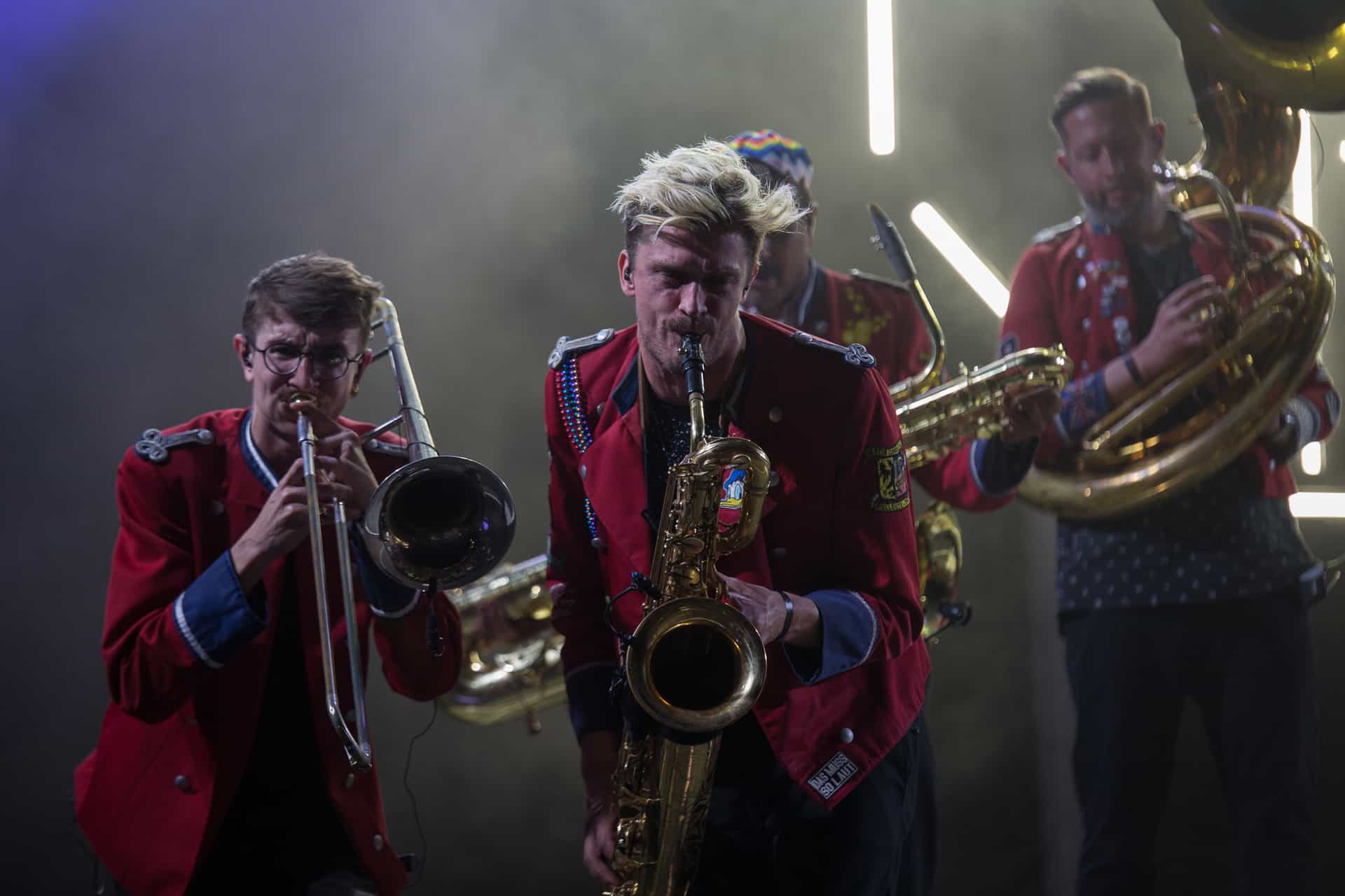 Nous ne bougerons pas du secteur après ce concert, histoire de pouvoir bien profiter de Meute dont toutes les dates ont été annulées ou repoussées ces derniers mois. Cette fanfare « électro » allemande est une vraie machine à faire danser déployant une puissance hors norme et une énergie qui va renverser le J4. La recette, basée sur la reprise « organique » de titres électros, est diablement efficace car Meute y injecte une vraie identité et une énorme envie de communion avec le public. Certes, les 2-3 morceaux chantés n’apportent pas grand chose, mais le reste du show électrise la foule et file la banane à tout le monde. Quel bonheur de pouvoir enfin communier de la sorte après presque deux ans de distanciation sociale. La grosse claque du festival tant cette musique correspondait à un vrai besoin de retrouvailles entre scène et public. Du pur plaisir pendant presque deux heures.