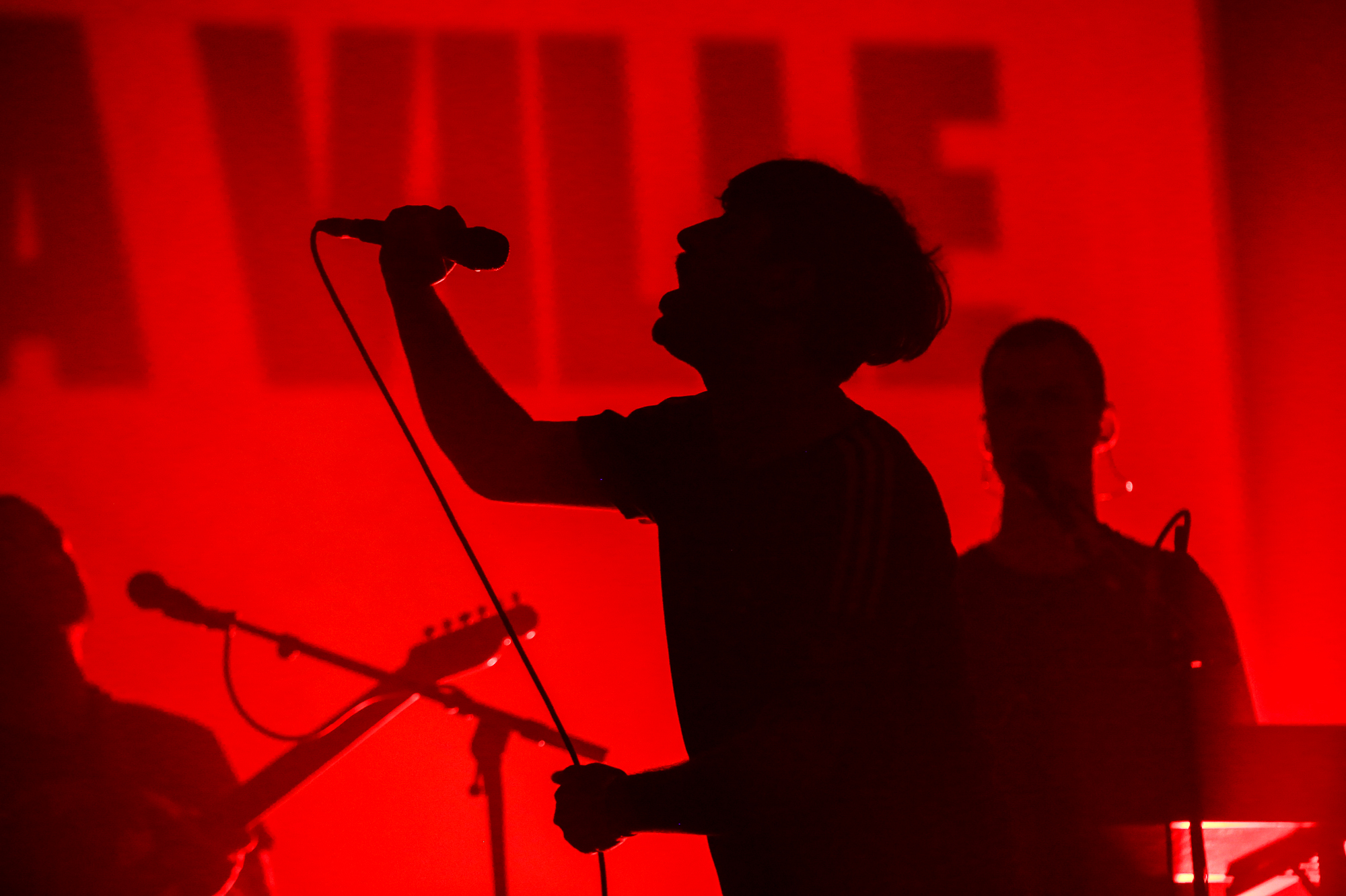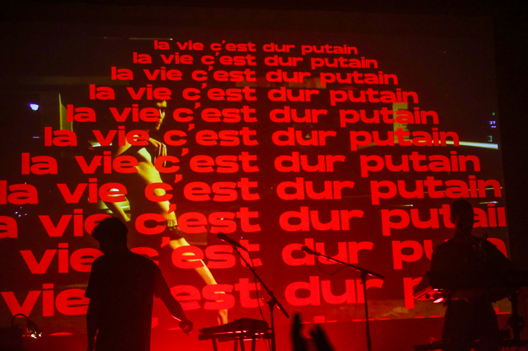 Mais pour l’instant, c’est Gwendoline qui va s’emparer de la scène. Le dispositif scénique est composé d’un écran qui diffuse des images très explicites et engagées, souvent surmontées des paroles, ce qui crée un karaoké très efficace pour gueuler tout notre désespoir du monde moderne. C’est d’ailleurs avec La fin du monde que le set démarre. De quoi entrer dans le vif du sujet avant de s’ambiancer sur Clubs puis l’incontournable Chevalier Ricard qui parle de cette facilité à décrocher avec le quotidien ou avec la vie en en n’ayant plus rien à foutre de rien.