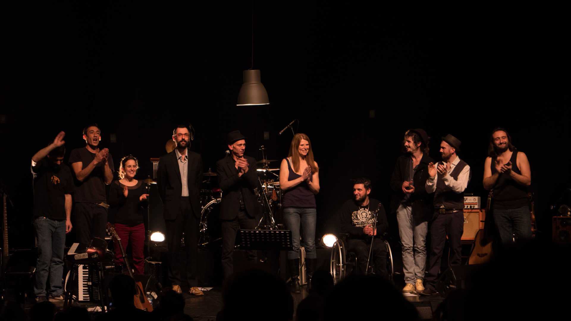 Tous les artistes se rassemblent sur scène, et sans qu’on s’y attende, Alexis, puis Xuan, commencent à chanter « Y’en a pas un sur cent, et pourtant ils existent… » Léo Ferré est tout naturellement à l’honneur, Les Anarchistes résonnent dans la salle, la plupart stéphanois pour l’occasion, le poing est levé, le moment est beau, tous les artistes y vont de leur couplet, l’espoir plane sur la salle. Et lorsque Christian Olivier, avec discrétion, enchaîne directement avec Les Oiseaux de Passage, on croit la soirée se terminer parfaitement.