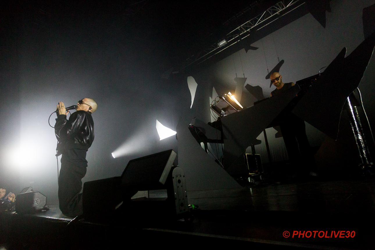 Malgré les notes un peu plus pop dans l’univers du dernier disque de Kompromat, cela jongle habilement entre les deux albums : retour dans le passé avec Niemand et les 80’s prennent leurs aises. La suite avec God is on my side, (« d’aussi loin que je m’en souvienne ») suspend le temps quelques minutes avec une ambiance brumeuse : les fragments du décor se mettent en mouvement et le tout devient hybride. Presque en lévitation, le tout finit par former le fameux « K » de Kompromat au-dessus de la scène. La fin du morceau s’emballe et on sent bien que le chaos n’est pas loin… le « K » finit par exploser de toute part laissant la lumière jaillir des morceaux restants. Point de bascule atteint.