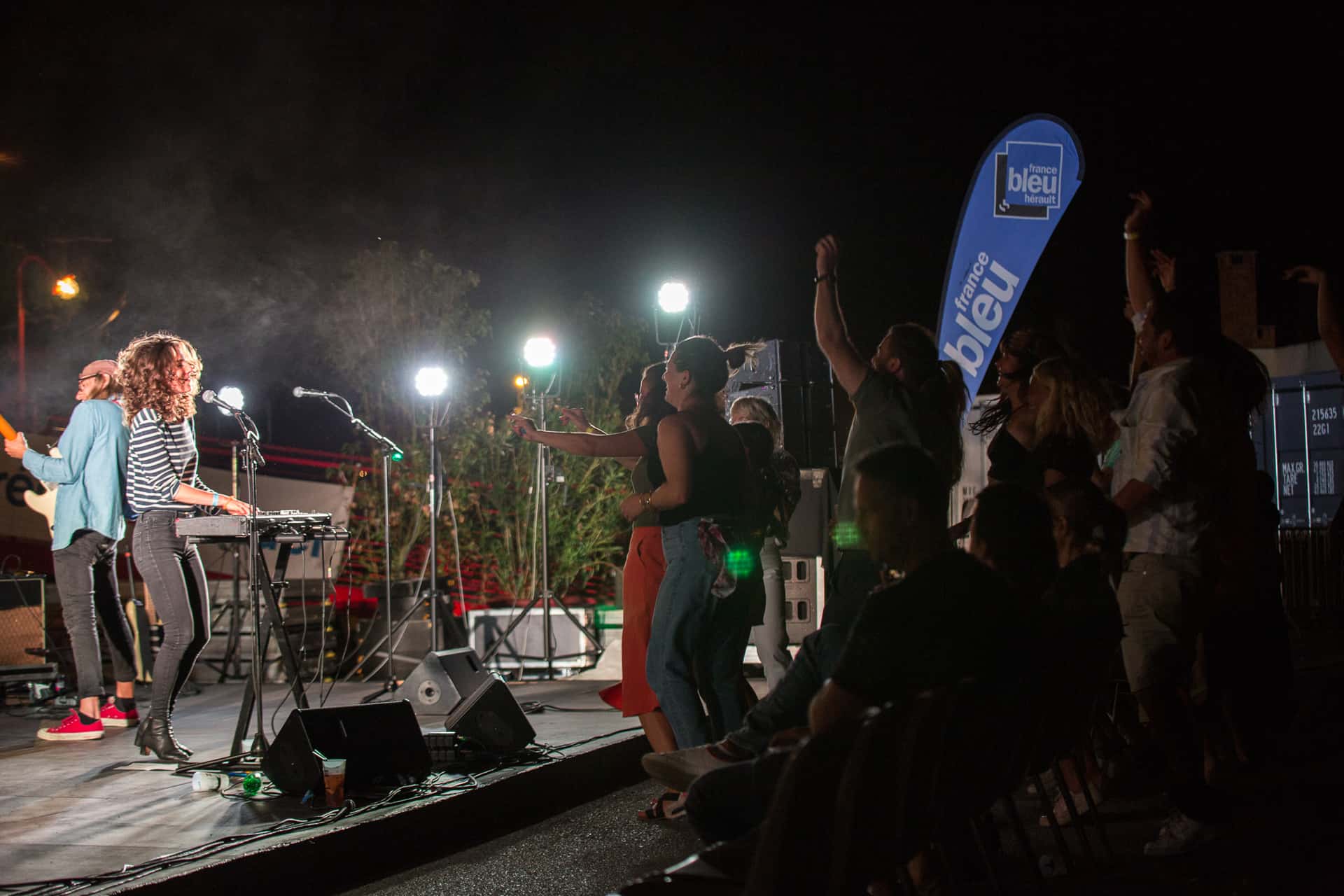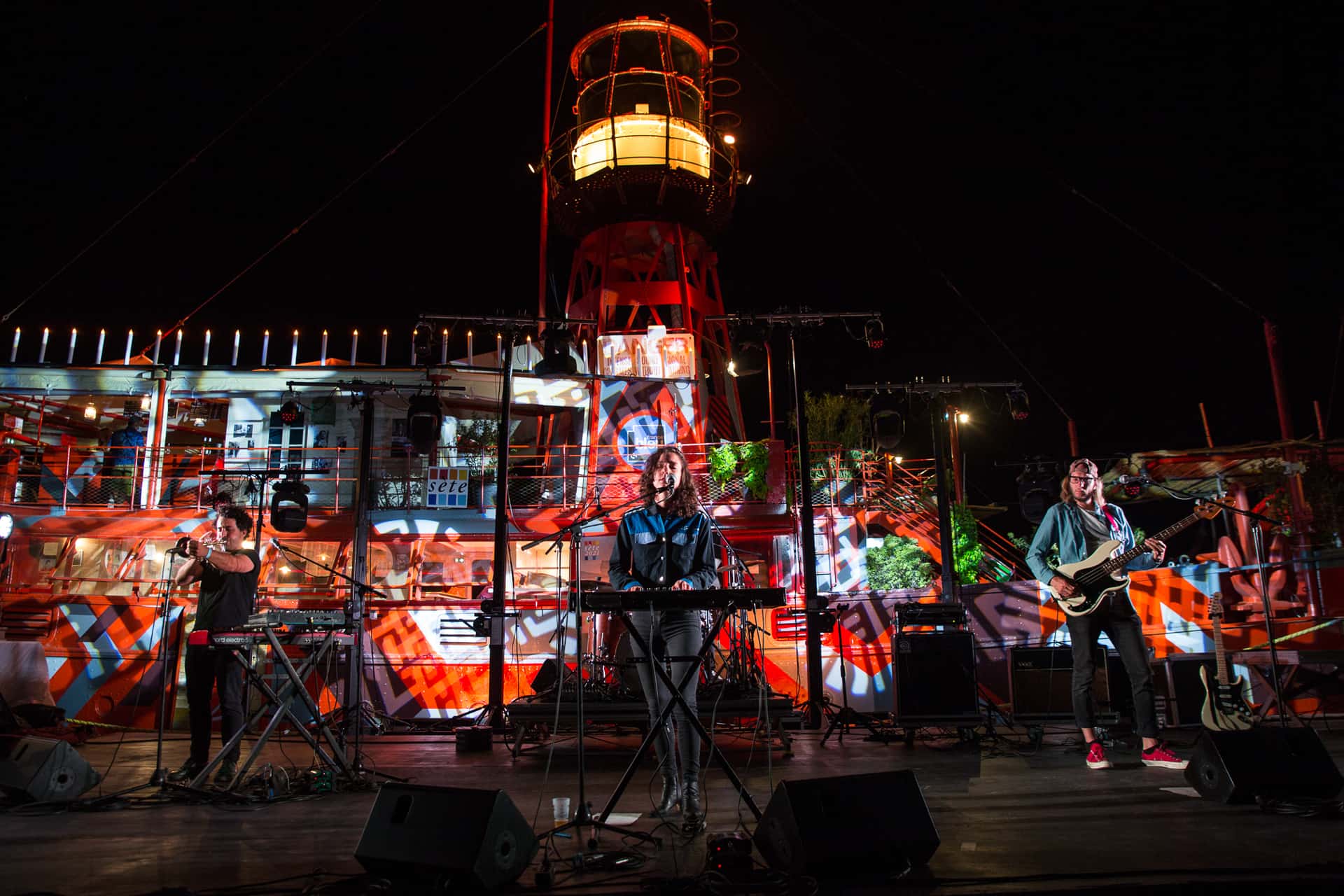 C’est un groupe plutôt euphorique et porté par la voix de Cléa Vincent que nous découvrons ensuite au pied du Roquerols. Cléa Vincent est présentée comme le porte étendard d’une certaine french pop portée sur le romantisme. Ce que nous en avons vu est surtout un joyeux groupe d’excellents musiciens qui avaient envie de nous faire danser malgré les chaises installées sur le quai. Si le set a démarré avec un peu de retenue (Cléa a expliqué qu’ils étaient inhibés comme si un célibataire depuis 5 ans devait rouler une pelle), l’ambiance sétoise a permis de rapidement lâcher les chevaux. Aux commandes derrière son clavier, Cléa Vincent a déroulé ses morceaux de pop « brésilienne » dansante ainsi qu’une très réussie reprise de Femme est la nuit de Dalida.