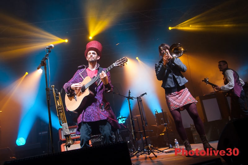 Puis arrivait l’un des groupes attendu au tournant : ASM dont nous vous avons présenté le dernier album : « The Jade Amulet » l’année dernière. Force est de constater que le groupe sait aussi bien faire résonner ses textes sur scène que dans leur cd. Une section cuivre des plus animées, entre trompette, trombone et saxo, a su tenir la dragée haute aux deux rappeurs du groupe pendant l’heure et demi de set. Le flow était propre, les costumes fusaient sur les épaules des musiciens au rythme des titres, et le rendu est détonnant. Arrivant avec un peu d’appréhension au concert, on en sort rassuré, bien qu’il soit dommage que l’histoire travaillée sur le bout des doigts, perde de son intensité pour tous les festivaliers n’ayant pas la chance d’être parfaitement bilingues.
