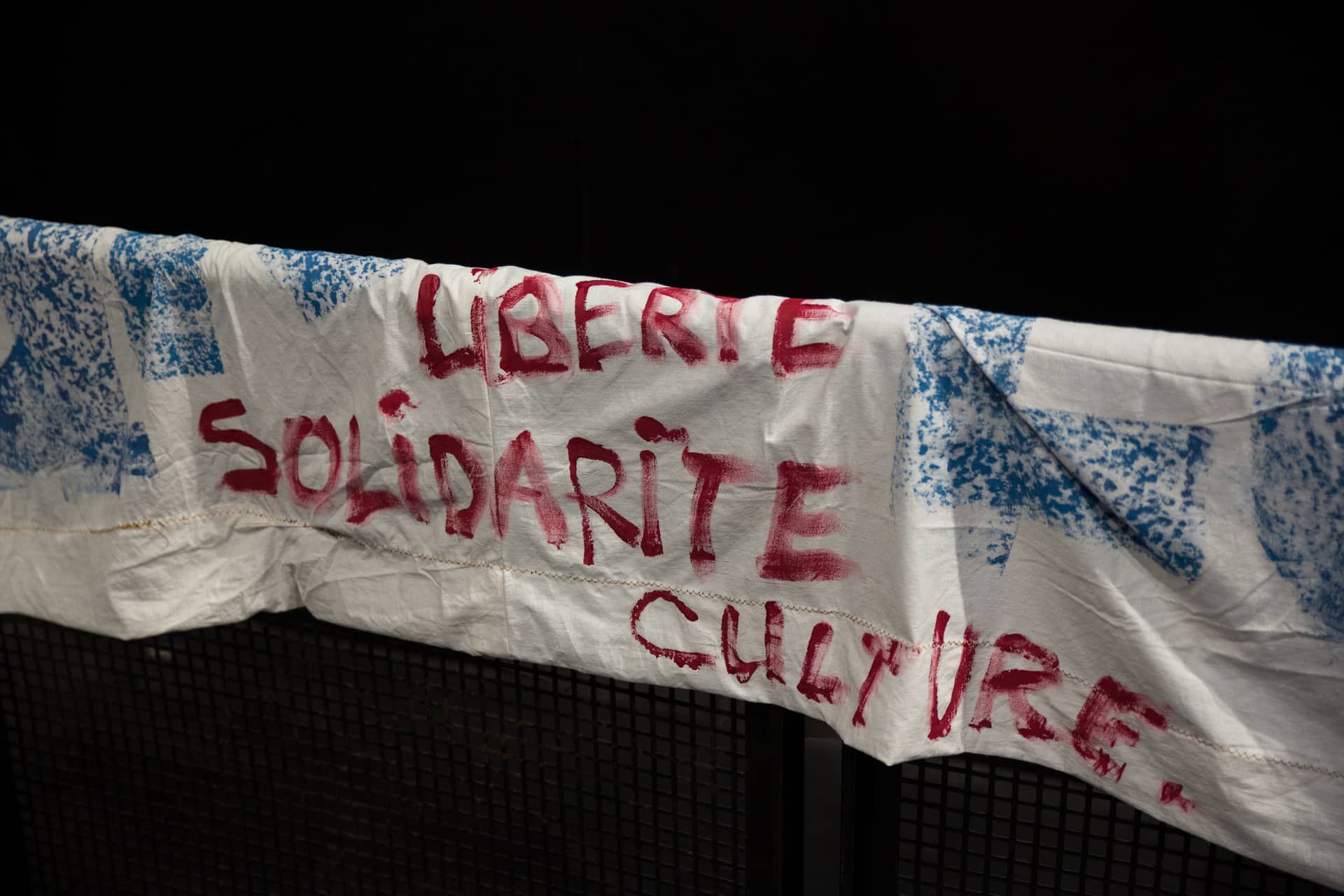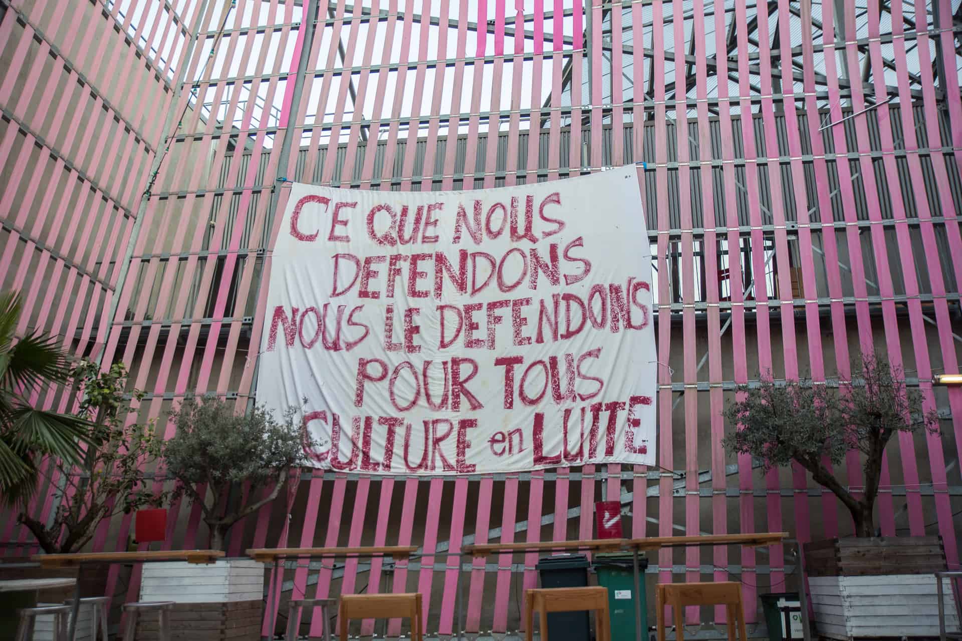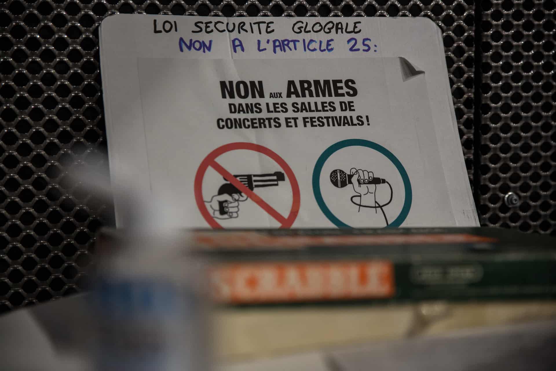 Le couvre feu approchant, nous nous hâtons de rejoindre la salle nîmoise et nous préparer à passer la nuit dans une salle où nous n’avons plus entendu de musique depuis (trop) longtemps. Sur le chemin vers l’entrée, nous croisons Sarah, les bras chargés de pizzas (merci Rage !) puis Fabien. Trois voitures sur le parking, personne devant l’entrée, il est clair que nous ne sommes pas là pour une soirée de concert. A l’entrée, un agent de sécurité est pourtant présent. Puis direction le Patio, pour retrouver les occupants du jour. Nous serons huit ce soir dont Fred et Stéphane, salariés de la structure. L’ambiance est très particulière dans ce lieu habituellement très rempli et bruyant. Une énorme banderole « Ce que nous défendons, nous le défendons pour tous » est accrochée dans la structure métallique. Car au-delà de la culture, c’est bien la question de la précarité qui est au centre des revendications des différents collectifs en lutte.