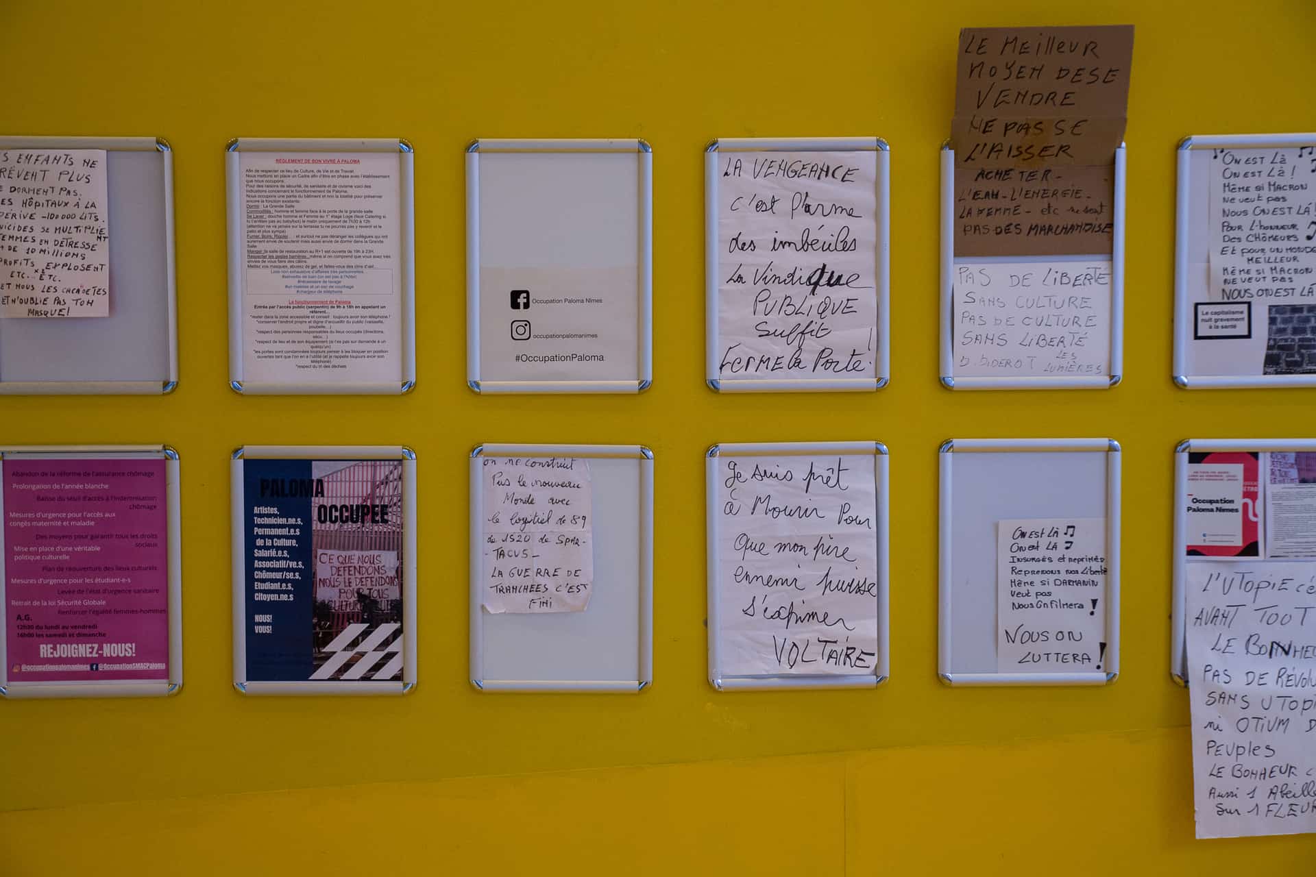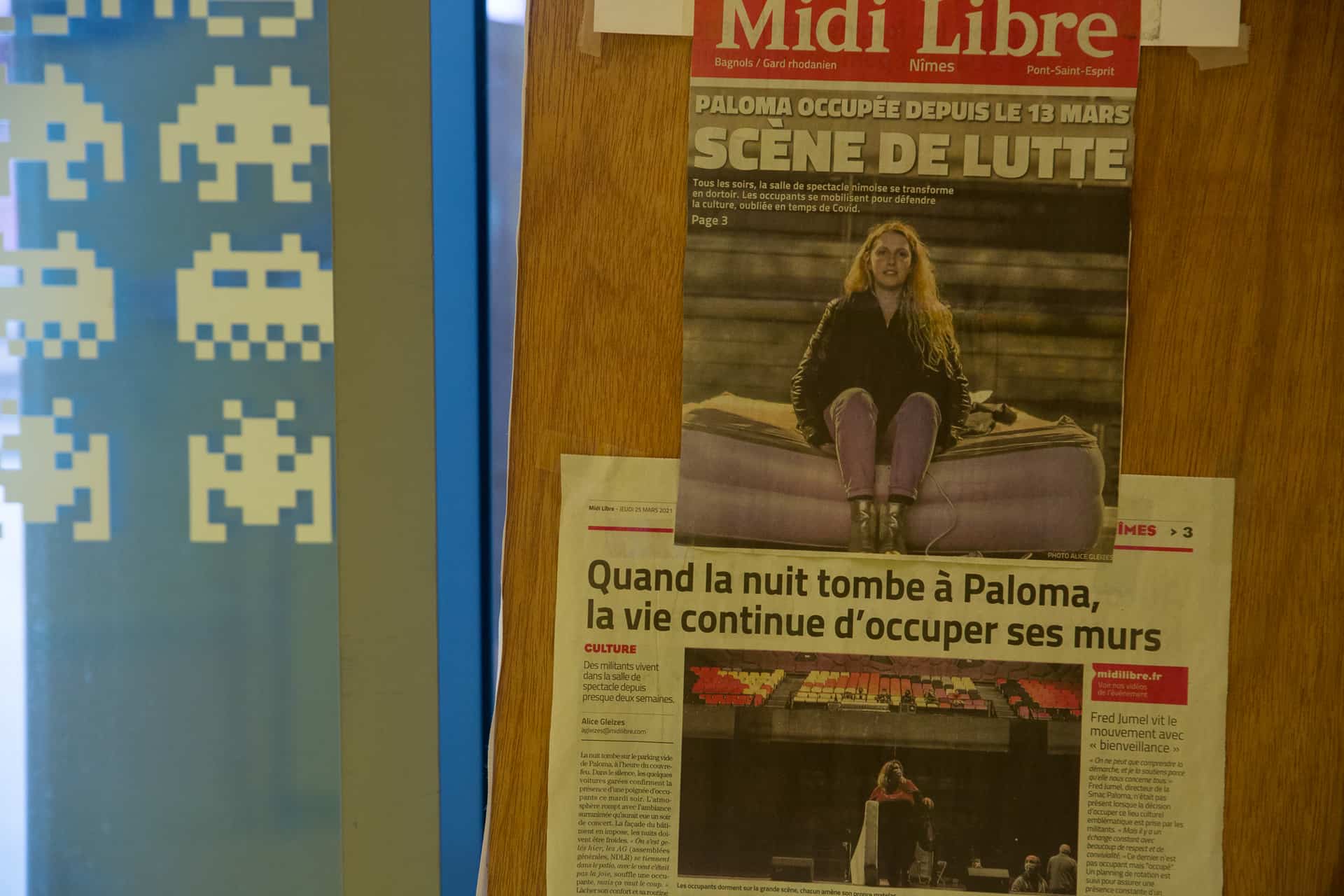 Vous en avez certainement entendu parler. Depuis le 8 mars, le théâtre de l’Odéon à Paris a appelé à occuper les lieux culturels dans la lignée de l’occupation des ronds-points. Cette occupation, qui a réellement débuté le 4 mars, s’est rapidement étendue à toute la France. La salle de musiques actuelles de Nîmes, Paloma, a suivi le mouvement à partir du 13 mars, dans la foulée du rassemblement en soutien à l’Odéon. Aujourd’hui pas moins de 100 lieux sont occupés en France, tous mobilisés contre la réforme de l’assurance chômage, contre la loi sécurité globale (qui va permettre à des policiers de garder leur arme hors service dans les lieux de culture), pour la prolongation de l’année blanche pour les intermittents ou pour la réouverture des lieux culturels. C’est donc en soutien à Paloma et pour participer à la lutte que nous nous sommes invités fin mars, dans la salle nîmoise, pour partager ce moment très spécial avec les occupants.