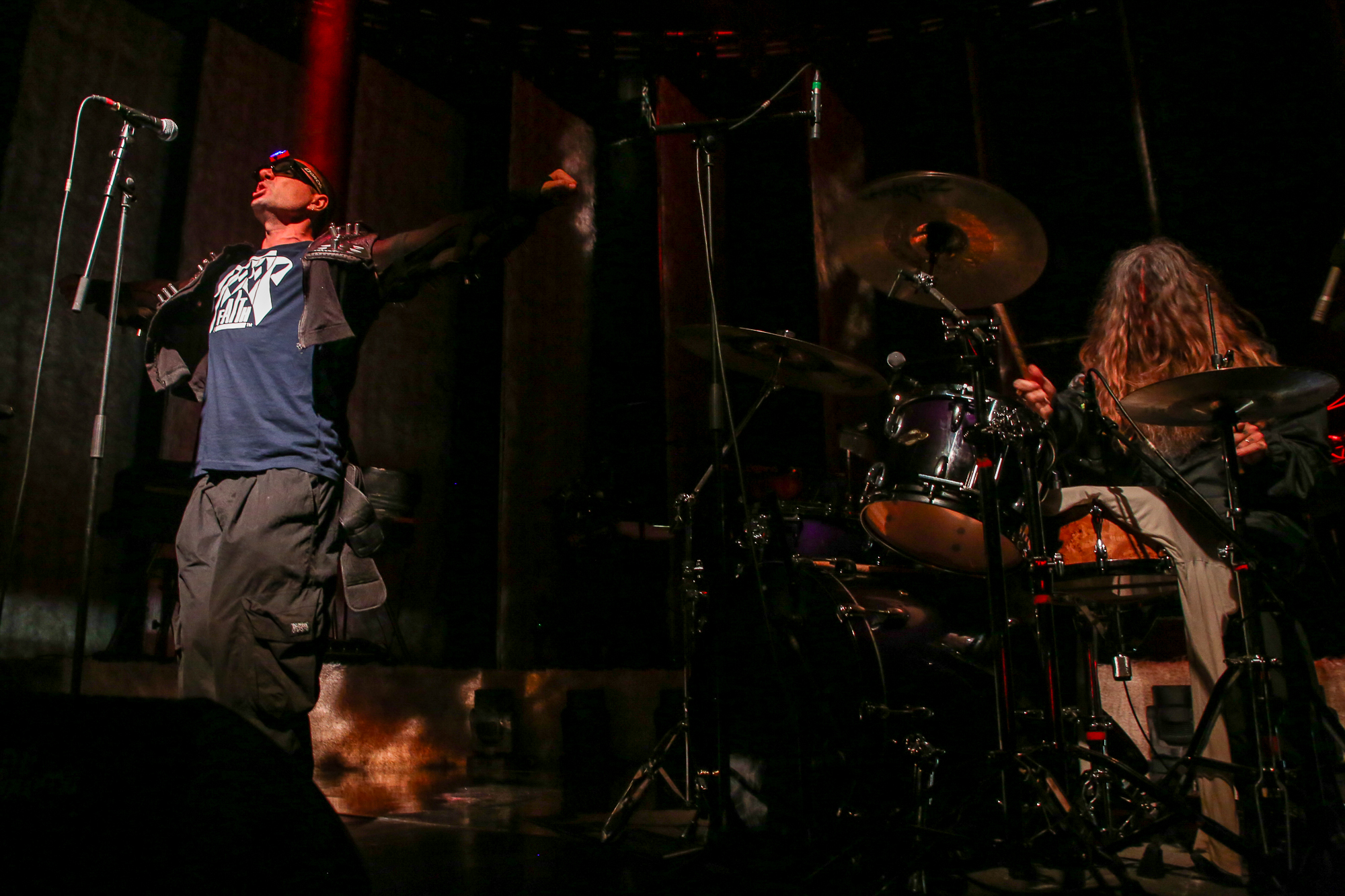 C’est d’ailleurs une sacrée surprise qui se présente à nous en première partie avec un duo plus qu’original tout droit venu d’Australie, DeepFaith. Bon, en fait ils vivent désormais à Paris mais ceci ne change rien à leur originalité. Le duo se compose du très excentrique Byron Spencer au chant, flûte ou laser et de Danial aux machines et batterie (et anciennement batteur des excellents Midnight Juggernauts qui ont produit l’incontournable « Into the Galaxy » à la fin des années 2000).