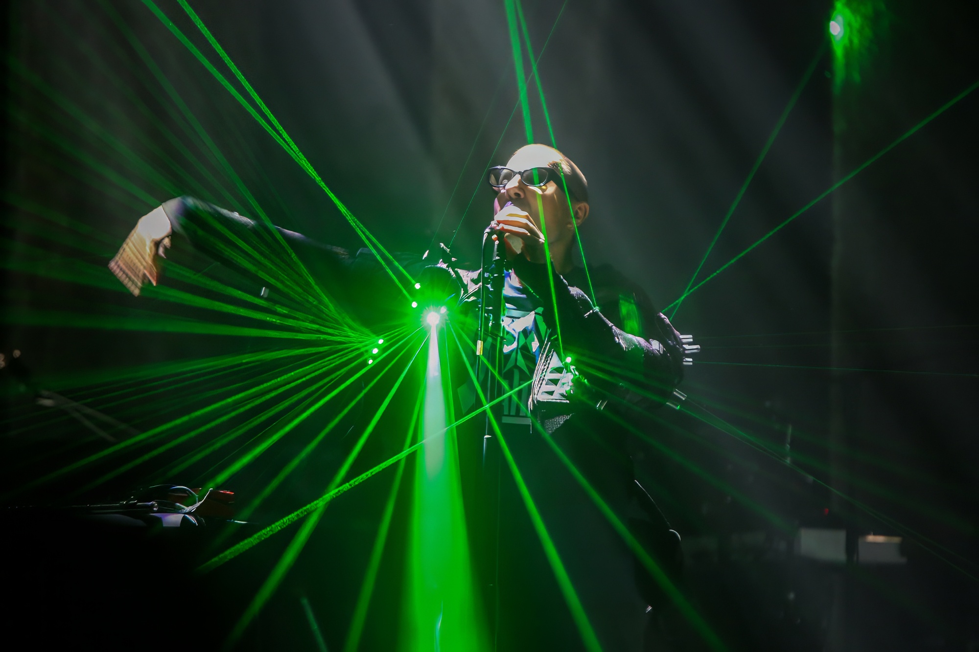 C’est sur le cultissime Sexual Sportswear que le show débute. Un long morceau instrumental qui plante le décor et nous plonge immédiatement dans l’univers de l’iconique compositeur. Accompagné sur scène par quatre musiciens (deux synthés, une guitare, une batterie), la configuration nous rappelle le concert que nous avions vu à Arles en 2021.
