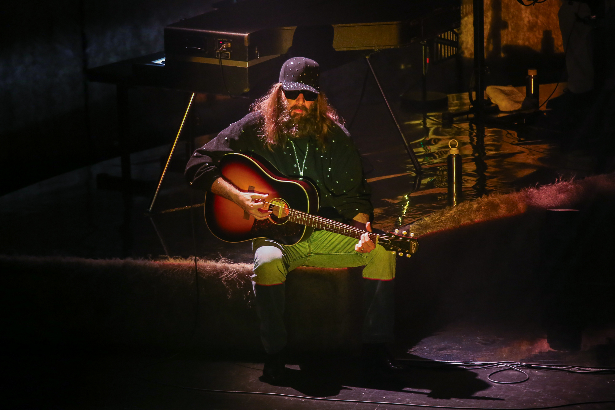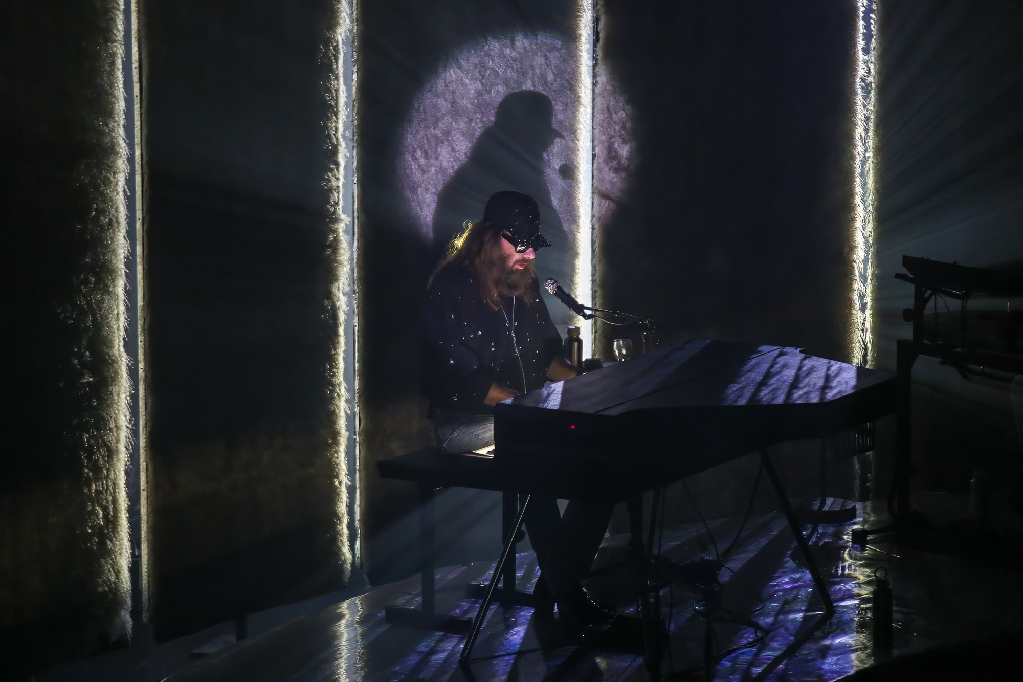 Le temps s’étire lentement après cette expérience surprenante. Puis, petit à petit s’installe une drôle de musique dans laquelle se mêlent des hennissements de chevaux avant l’arrivée, depuis le fond de la scène, de l’imposante silhouette de Sébastien Tellier.
